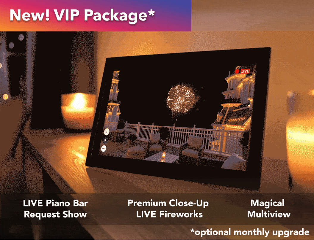 And that's just the beginning! Unlock the full magical potential of your Wait Time Display with the brand new VIP Package Upgrade* featuring 3 premium features: Close-Up LIVE Magic Kingdom Fireworks (nightly), Magical Multiview, & LIVE Monthly Piano Bar Request Shows. Feel connected to the parks...even when you're miles away!