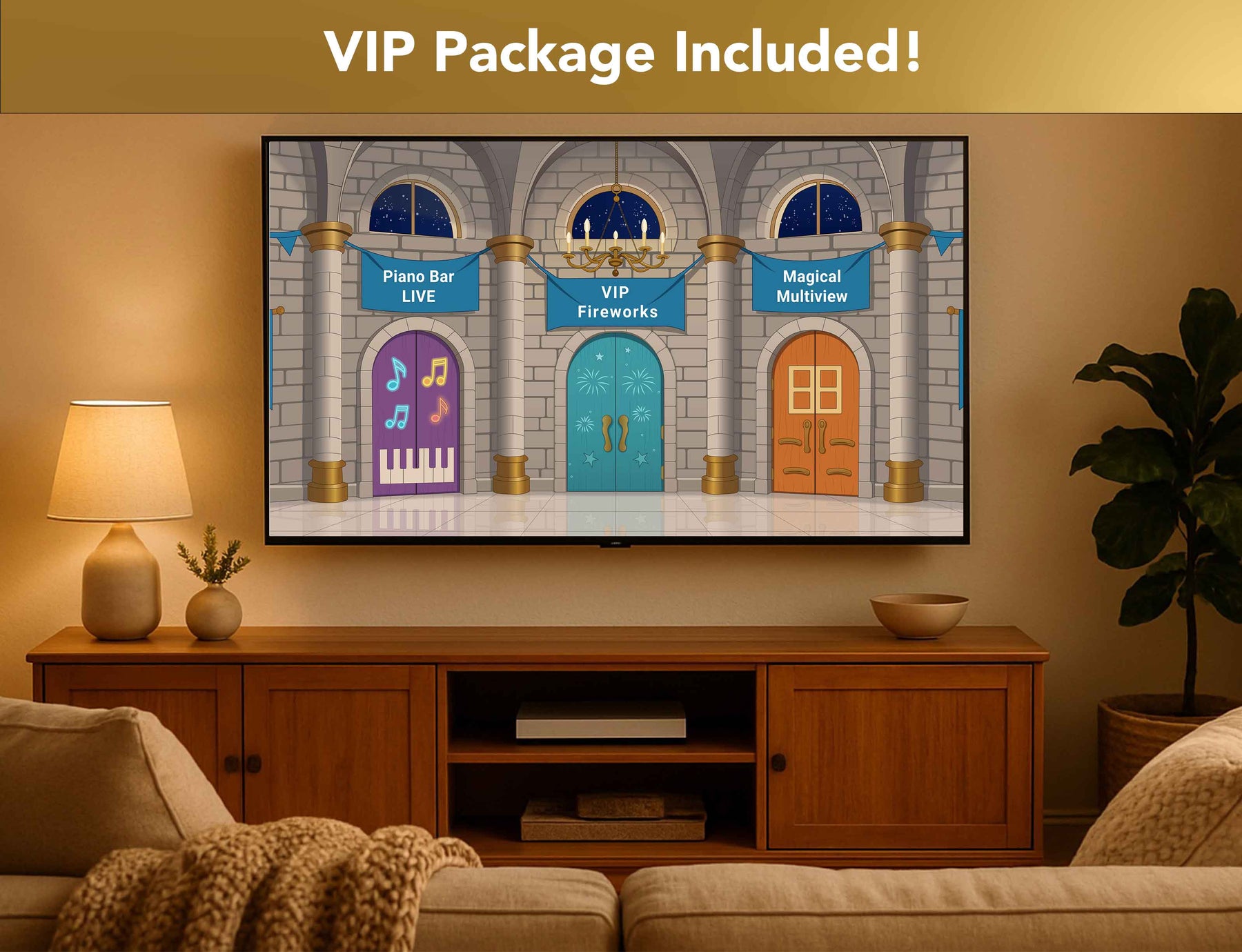 1. Add a new subscription: Most of our customers choose this! Your existing Wait Time Sign or Display will continue to run just as it does today, while your new Wait Time TV unlocks premium HD visuals, high-resolution fireworks4 screen Multiview, live piano bar performances, & more that all sound and look incredible on the big screen! It’s the best of both worlds — your display stays on all day for park info and ambiance, while your TV becomes your immersive entertainment hub.