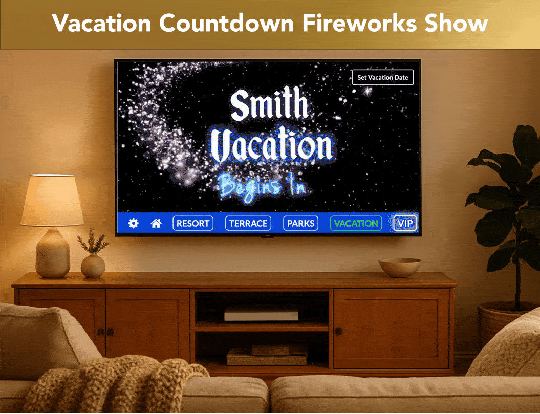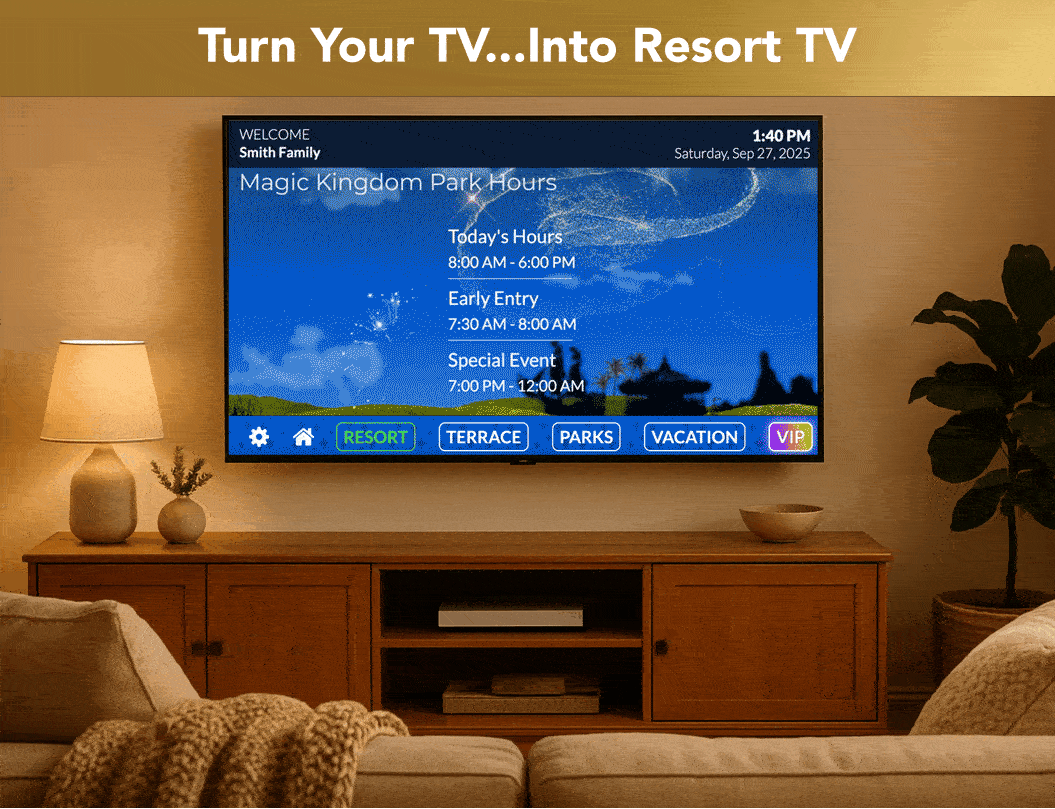 Imagine your TV welcoming you home with a personalized greeting just like checking into your resort for the first time. Enjoy your very own Resort Channel , real-time ride wait times, a Vacation Countdown Fireworks Show, and even a live terrace view of the Orlando skyline—complete with nightly Magic Kingdom and EPCOT fireworks.